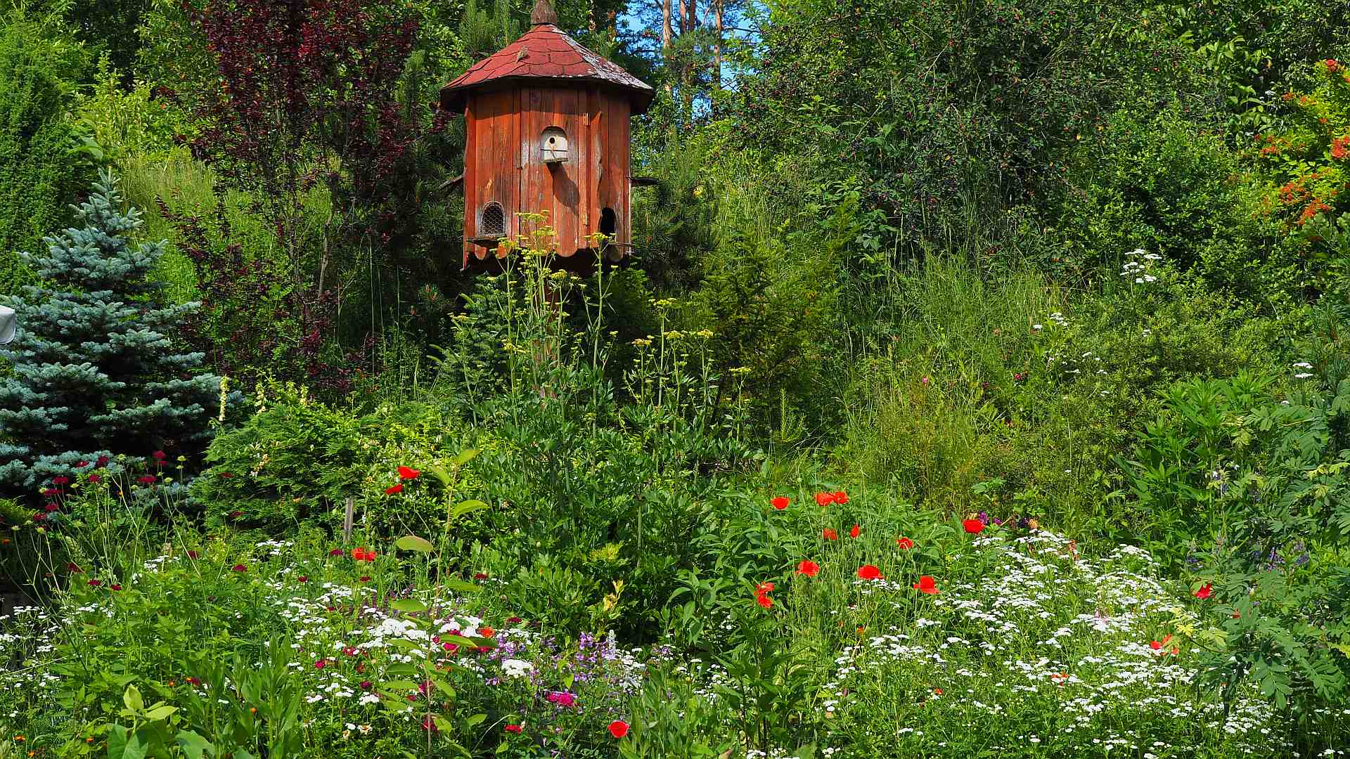 Naše zahrada obsahuje také prvky louky, některá místa sekáme jen jedenkrát ročně a to postupně, necháváme ostrůvky s vykvetlou trávou a květinami (kohoutky, kopretiny, zvonky…), vypadá to moc hezky a je to velmi důležité pro včely, motýly, kobylky, čmeláky, cvrčky…máme pak celé léto co pozorovat.