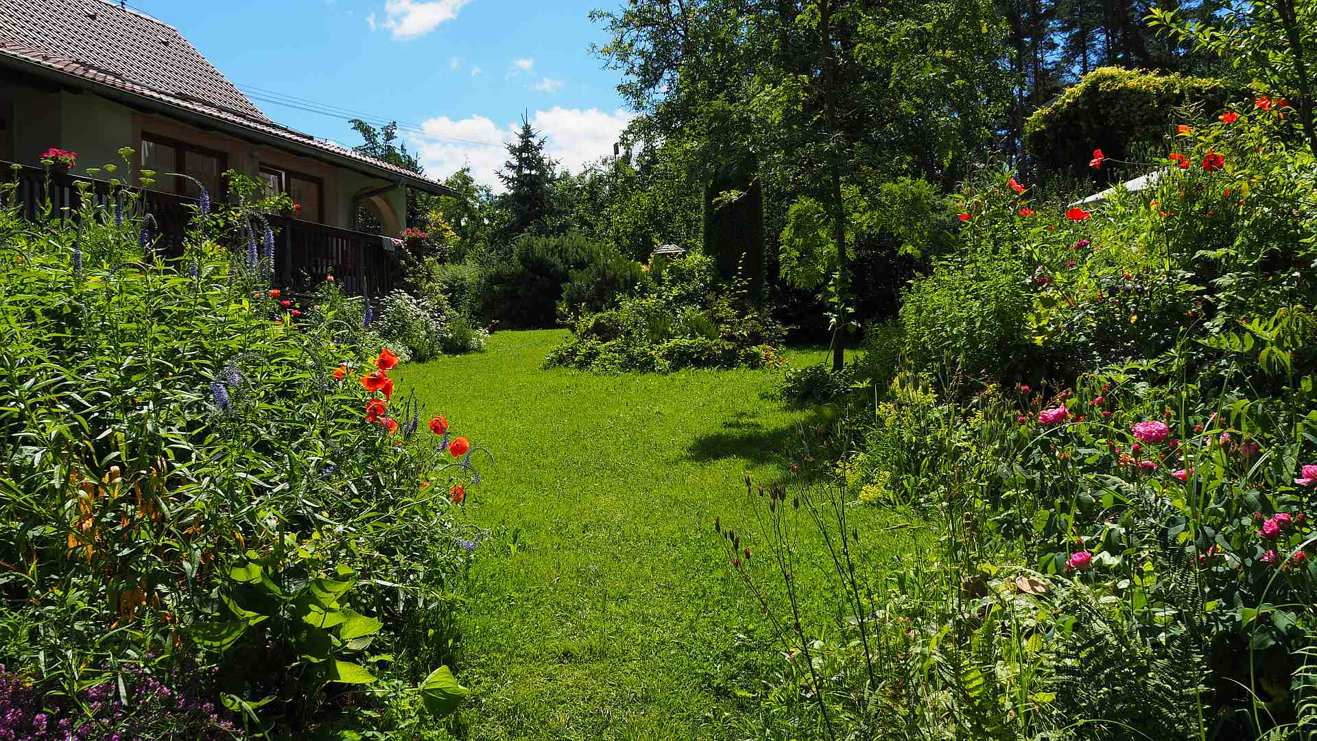 Naše zahrada obsahuje také prvky louky, některá místa sekáme jen jedenkrát ročně a to postupně, necháváme ostrůvky s vykvetlou trávou a květinami (kohoutky, kopretiny, zvonky…), vypadá to moc hezky a je to velmi důležité pro včely, motýly, kobylky, čmeláky, cvrčky…máme pak celé léto co pozorovat.